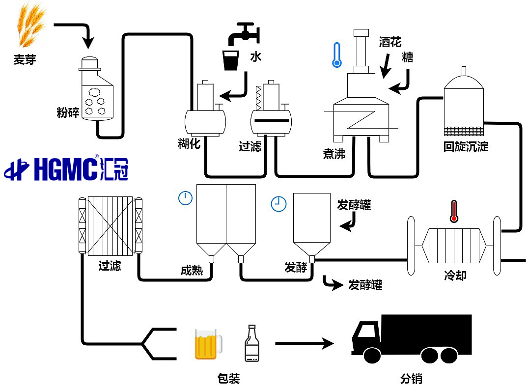 麥芽粉碎--糖化--過濾--煮沸(加酒花)--旋沉--冷卻--充氧冷卻麥汁(加酵母)--發(fā)酵。